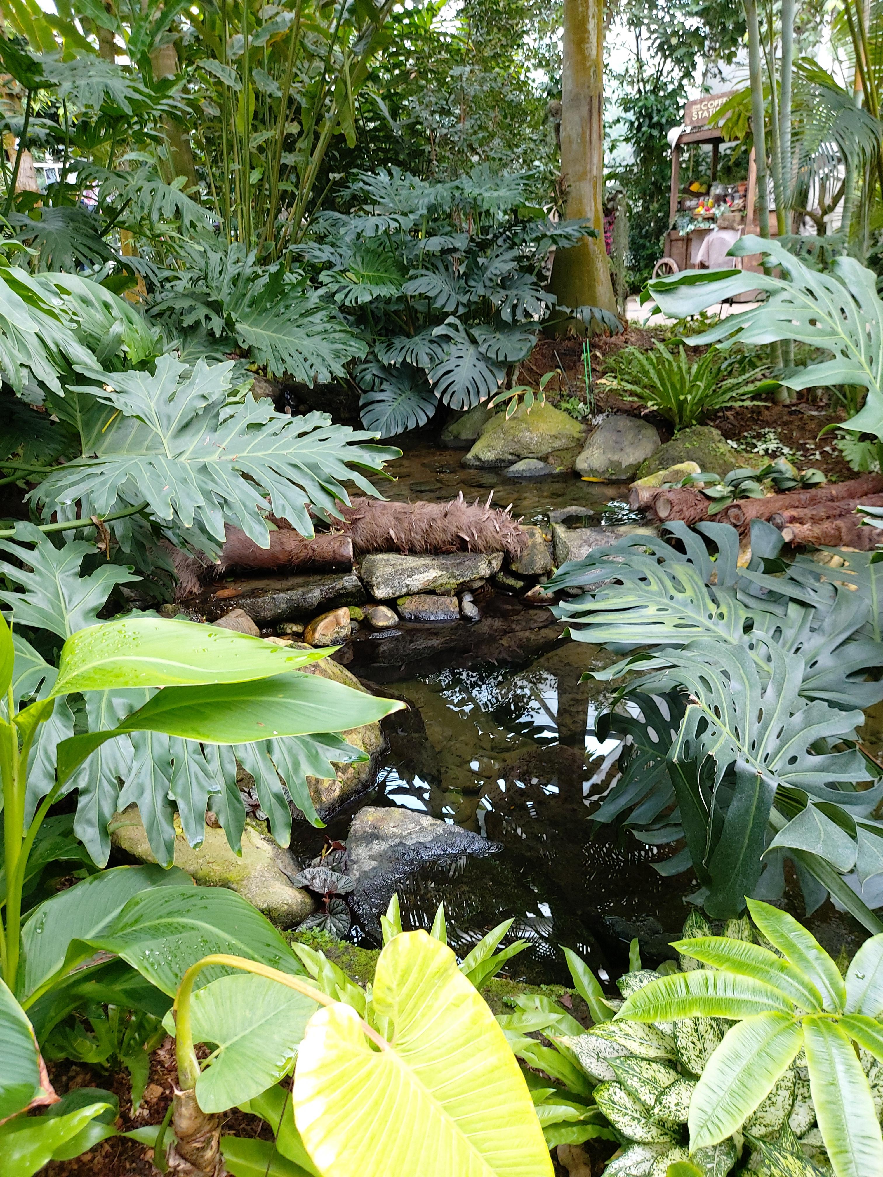 온실 가장자리 길목에서 연못 속 작은 구피들을 바라보면 마음이 평온해진다