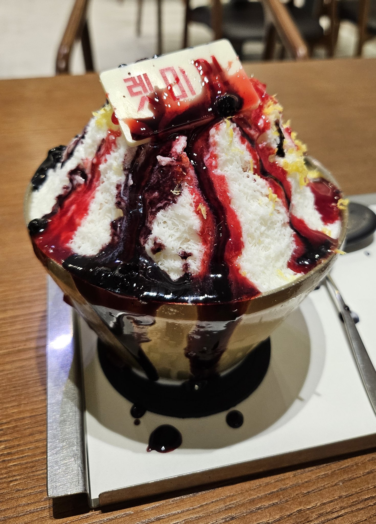 우유빙수에 라즈베리와 블랙베리 퓨레를 부어서 먹는다